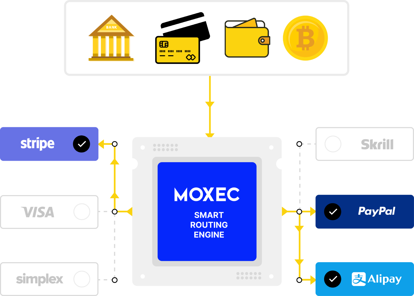Moxec Router prevents service interruptions from different payment providers from interfering with your business. It ensures seamless payment and maintains business continuity.